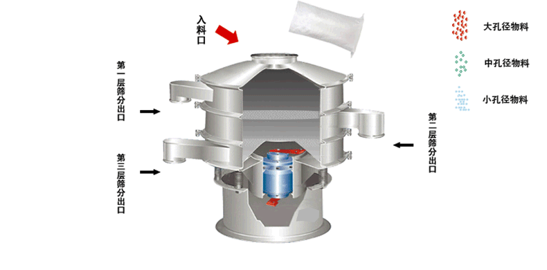 粉末涂料振動篩工作時,粉末涂層通過人工或機器投料到篩機內,在振動電機產生的振動力作用下,篩面上的粉末涂料迅速向四周擴散,小于篩孔尺寸的物料直接透網從下出料口排出,而大于篩孔的大顆粒物料被攔截在篩面上從排渣口排出,這樣就完成了粉末涂料的篩選工作。